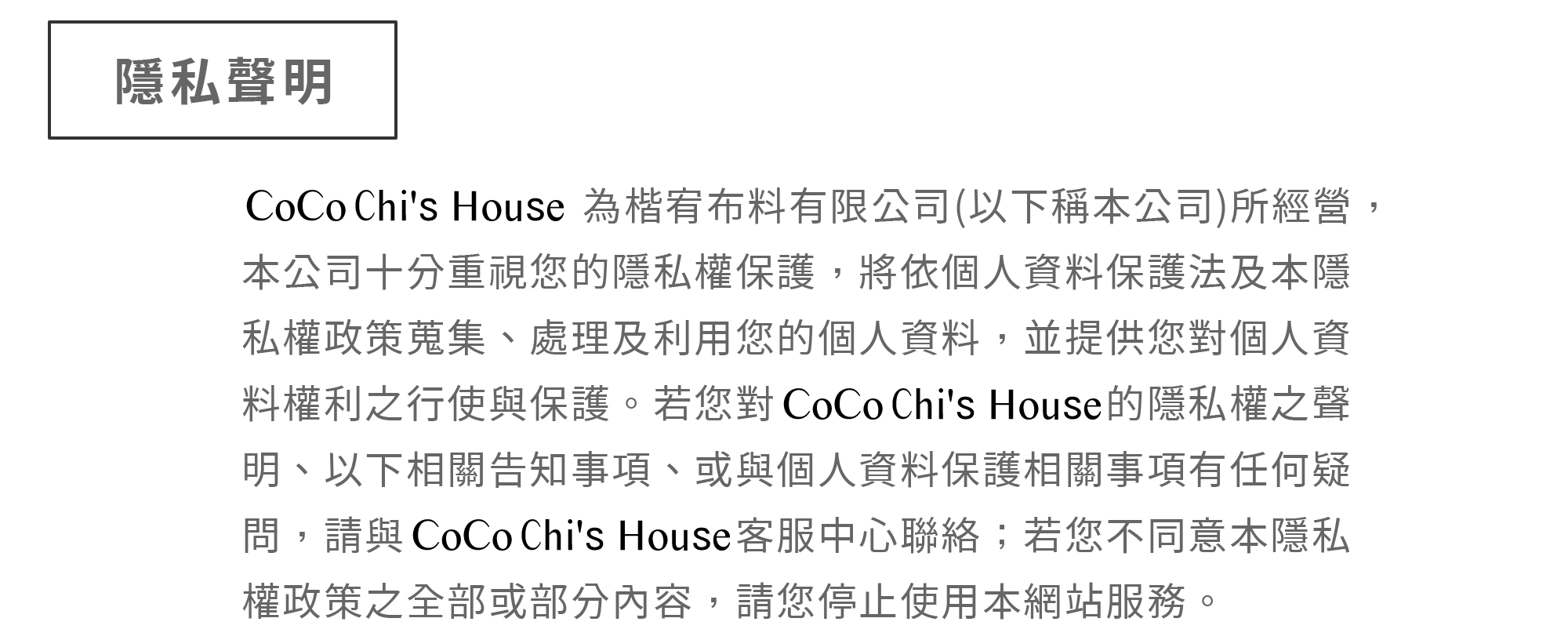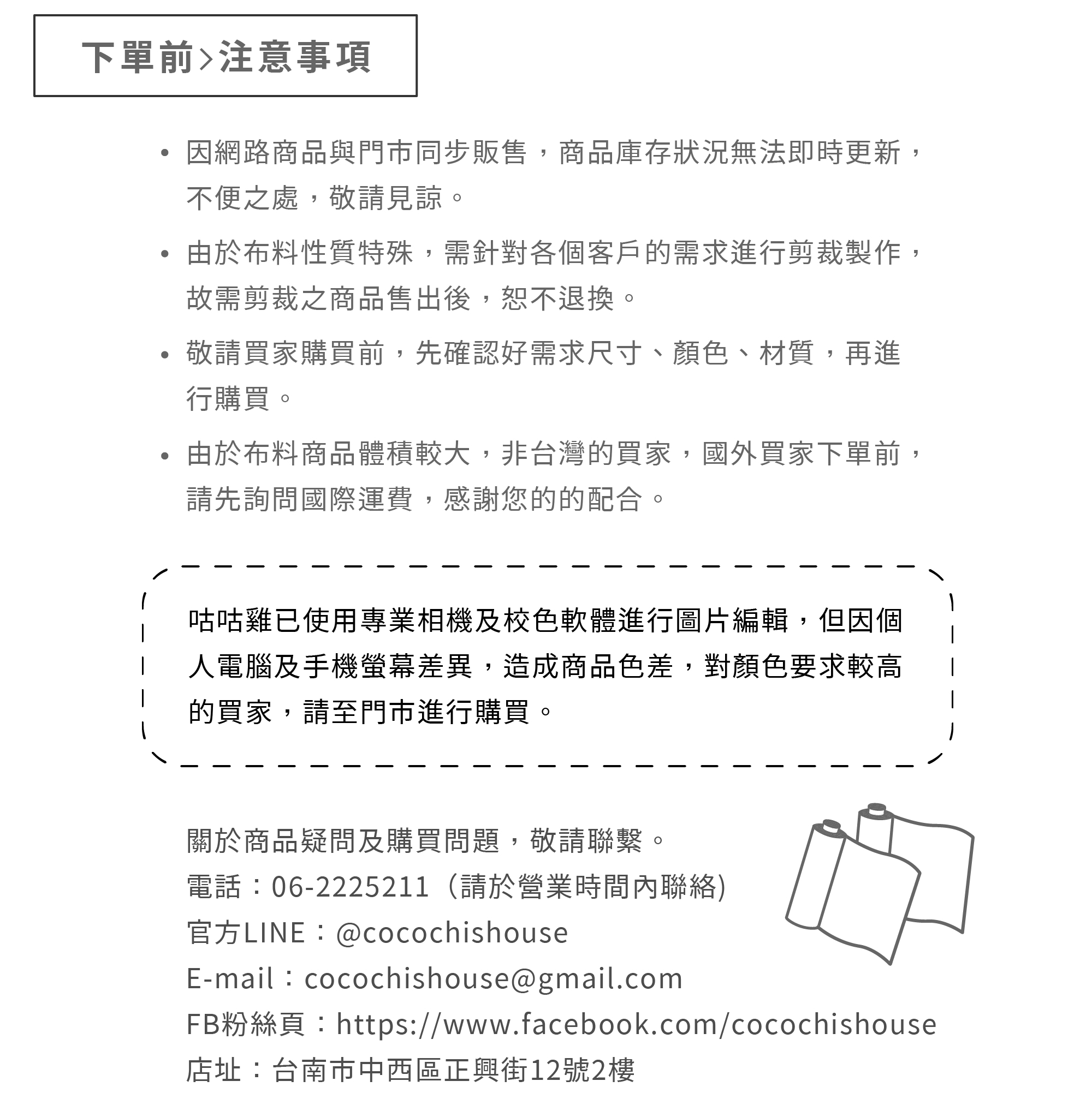 COMPANY 客服電話/+886-6-2225211 客服時間/10:00-19:00 LINE搜尋/@cocochishouse 地址/700台南市中西區正興街12號 (同公司聯絡地址) <週六、週日與國定假日公休> <網站仍然可以正常下單哦!>