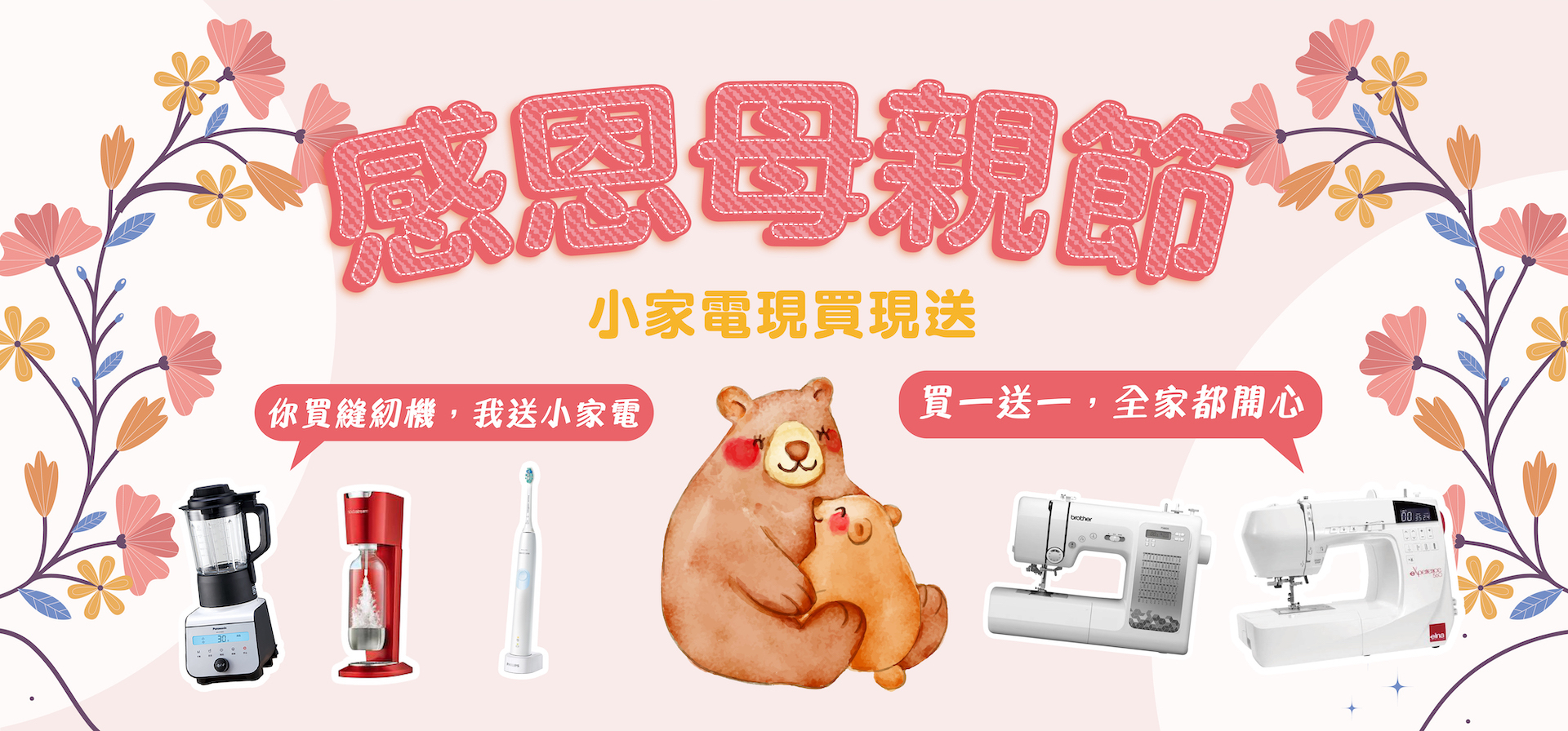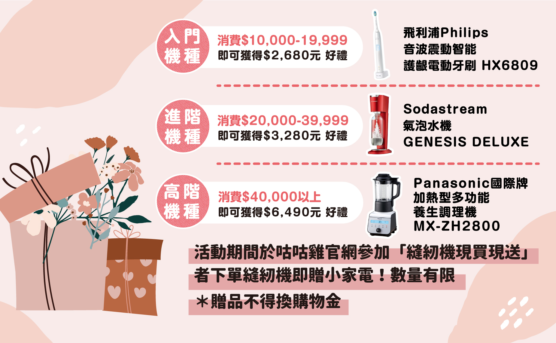 活動期間於咕咕雞官網參加「縫紉機現買現送」者,下單縫紉機即贈小家電。