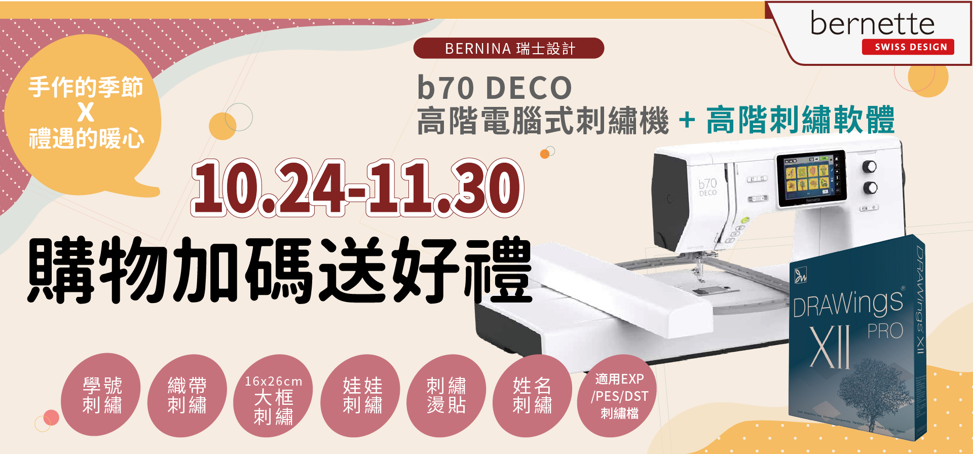 【Bernette】 b70 DECO高階電腦式刺繡機+Creative DRAWings XII 高階刺繡軟體(加碼贈5項好禮+軟體加碼贈)