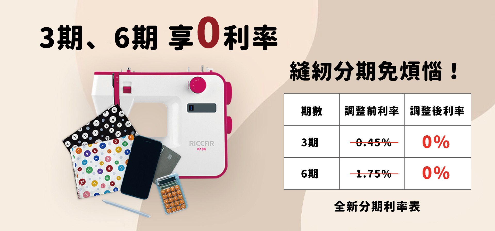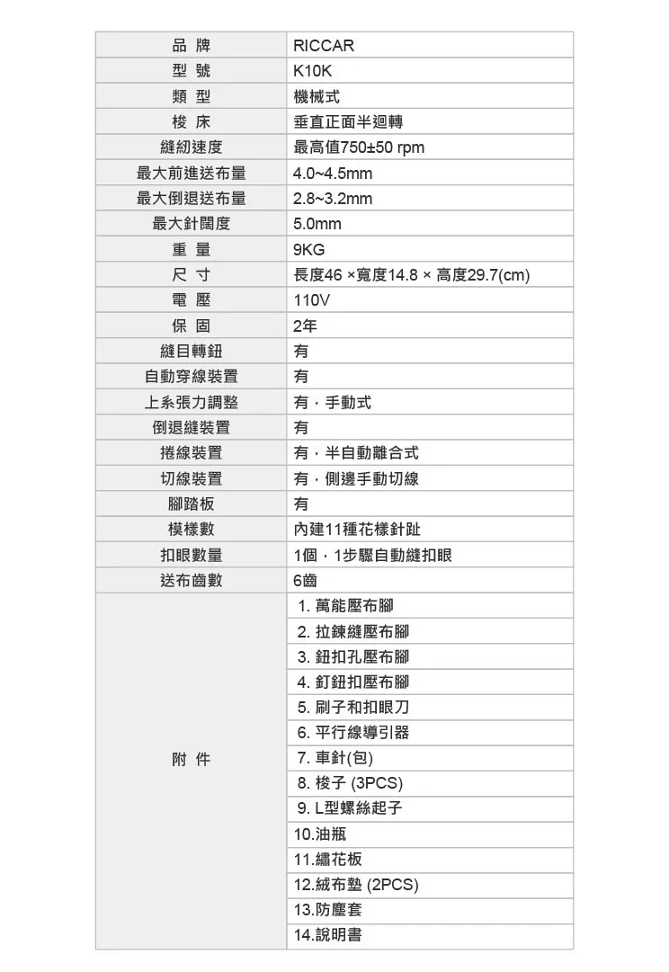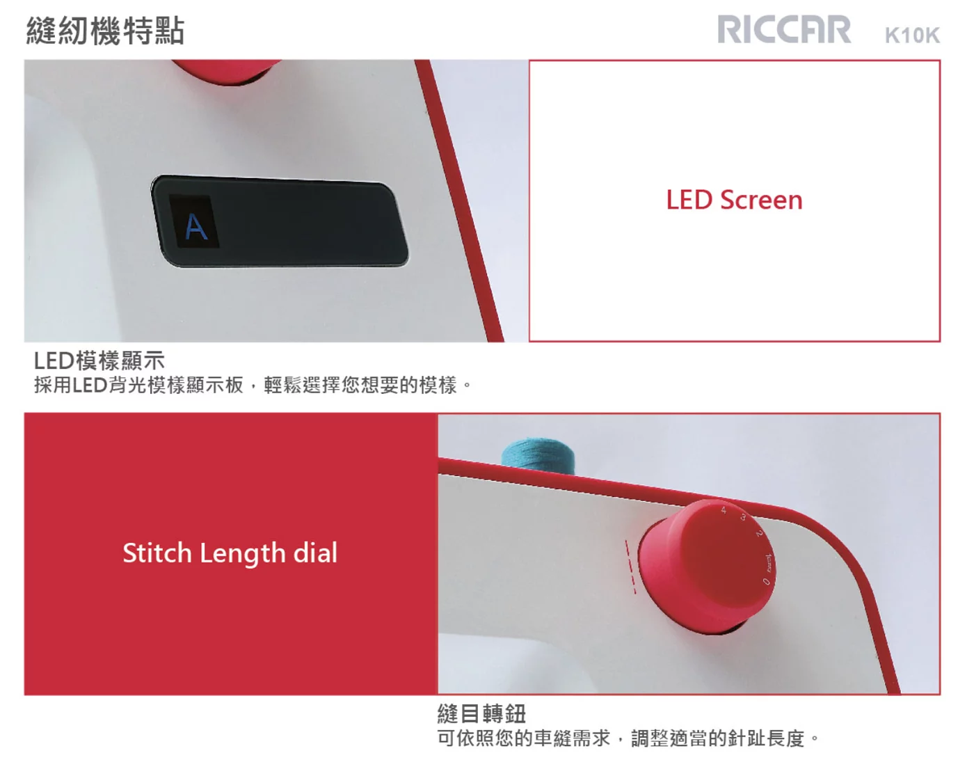 Riccar K10K 縫紉機 入門機種,12種針趾花樣,自動穿線功能,一步驟開釦孔,2年原廠保固。